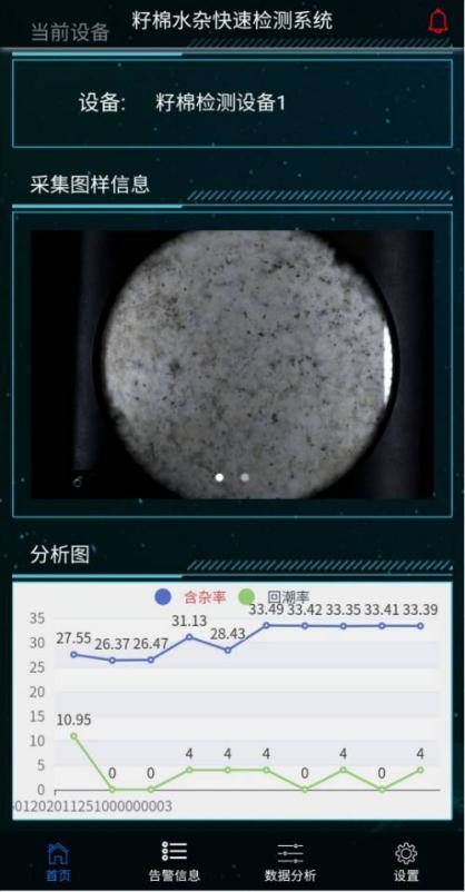 MJAZ-I型籽棉水杂快速检测系统是“国家重点研发计划”、“兵团科技攻关计划”重点支持项目,它采用光电检测、视觉成像、机器学习等技术,能够实现籽棉回潮率与含杂率的快速、准确、自动化检测。目前此系统单个样本检测时间为2-3分钟,检测结果高效准确,其中含杂率检测回归分析决定系数R²为95%,均方根误差RMSE为0.59%,回潮率误差为±0.5。同时,检测结果实时上传籽棉收购系统及物联网服务器,进而在手机app查看实时检测结果。项目申请发明专利1项,授权实用新型专利1项,软件著作权1项,发表SCI论文1篇,研发籽棉水杂快速检测系统1套。